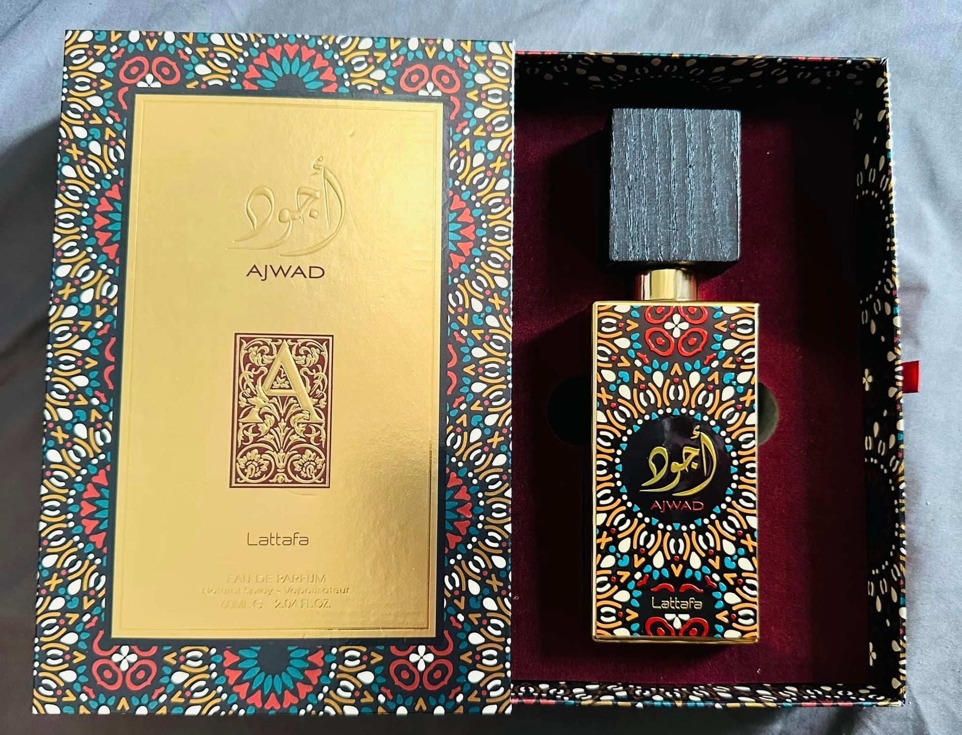 Ajwad de Lattafa Perfumes es una fragancia aromática amaderada para mujeres y hombres. Ajwad se lanzó en 2021. La Nota de cabeza es Notas afrutadas; las Notas de Corazón son rosa y jazmín; las Notas de Fondo son vainilla, almizcle, ámbar y cedro.