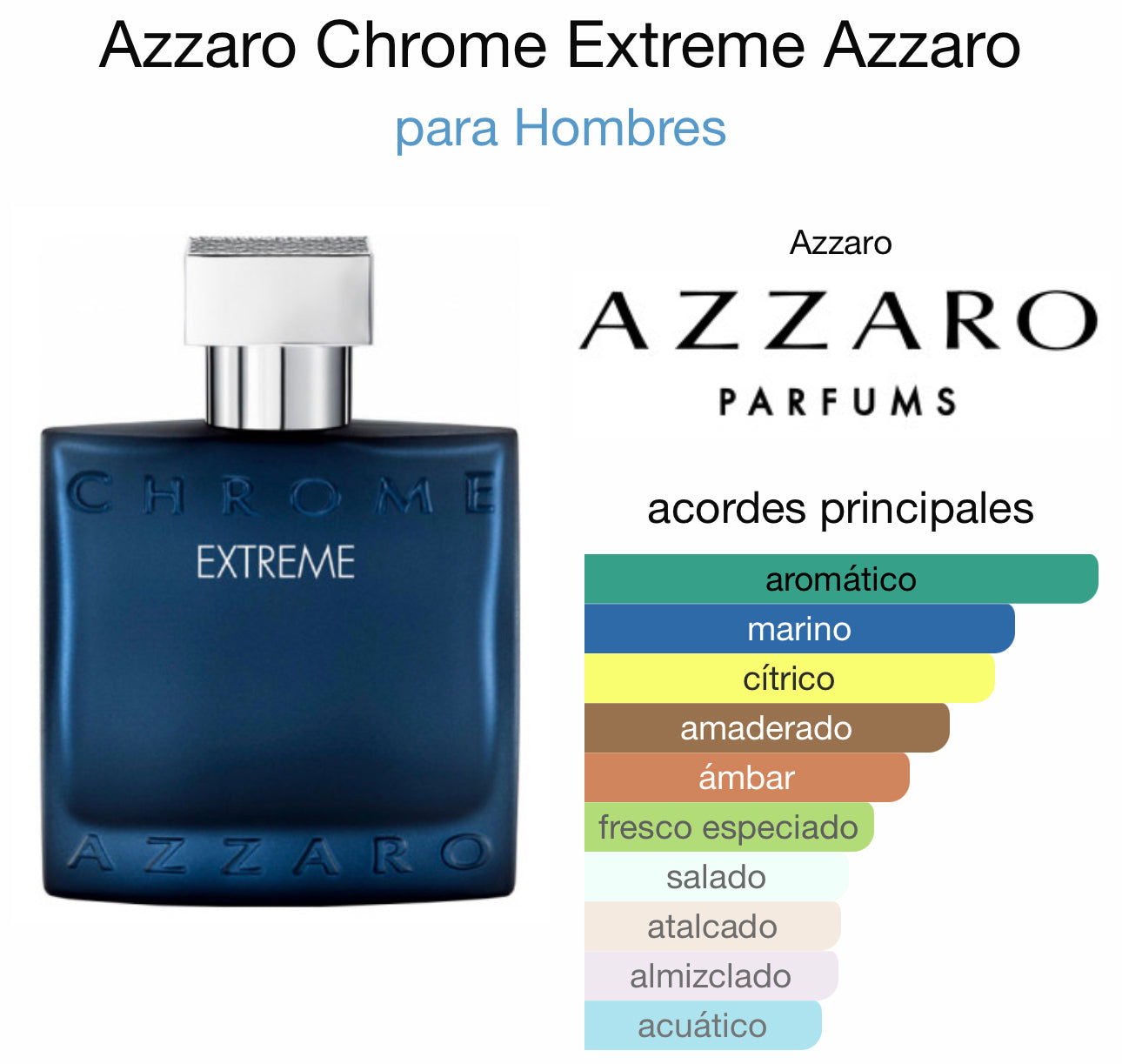 Azzaro Chrome Extreme de Azzaro es una fragancia de la familia olfativa Cítrica Aromática para Hombres. Azzaro Chrome Extreme se lanzó en 2020. La Nota de Salida es mandarina verde; las Notas de Corazón son notas marinas y bayas de enebro; las Notas de Fondo son cachemira y ámbar.
