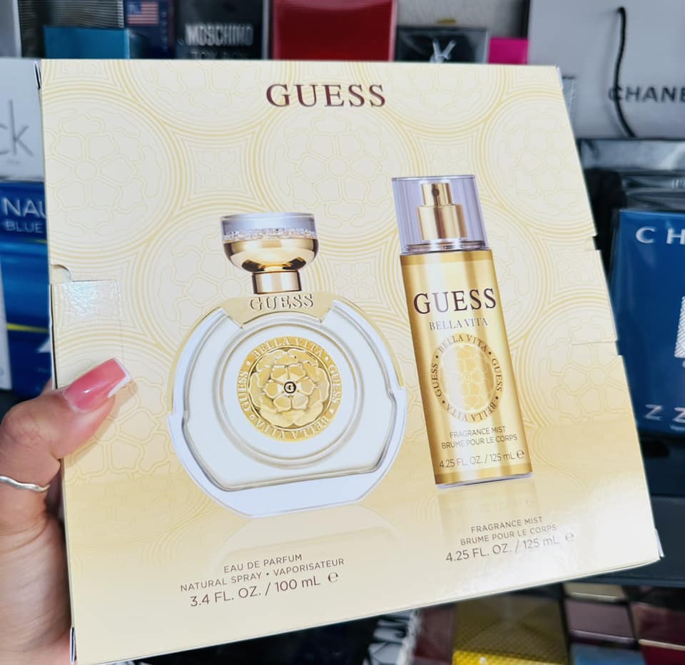 Bella Vita de Guess es una fragancia Floral Frutal Gourmand para mujer. Bella Vita se lanzó en 2020. Las Notas de Salida son cereza ácida, limón italiano y grosella negra; las Notas de Corazón son nardos, vainilla, orquídea y jazmín; las Notas de Fondo son praliné, haba tonka, madera de ámbar y almizcle.