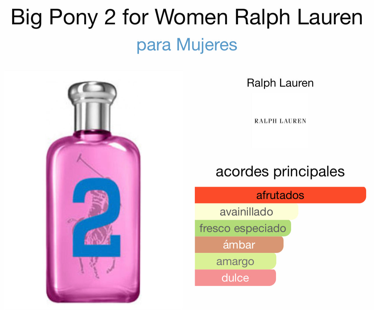 Big Pony 2 for Women de Ralph Lauren es una fragancia de la familia olfativa Floral Frutal para Mujeres. Big Pony 2 for Women se lanzó en 2012.