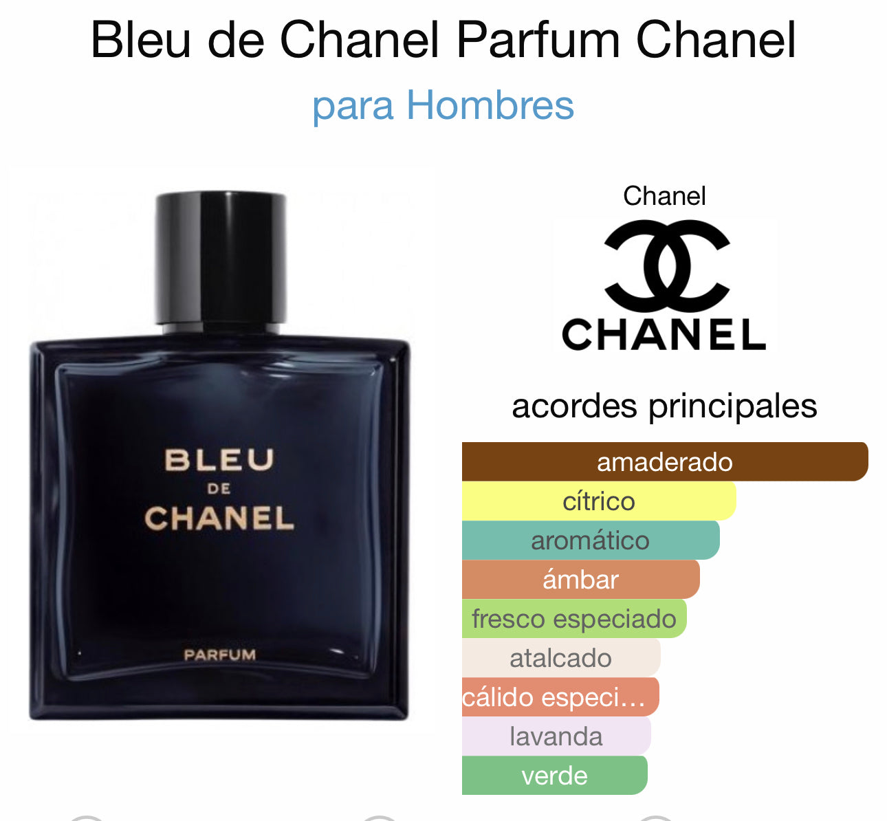 Bleu de Chanel Parfum de Chanel es una fragancia de la familia olfativa Amaderada Aromática para Hombres. Bleu de Chanel Parfum se lanzó en 2018. La Nariz detrás de esta fragrancia es Olivier Polge. Las Notas de Salida son Entusiasmo de limón, bergamota, menta y abrótano; las Notas de Corazón son lavanda, piña, geranio y notas verdes; las Notas de Fondo son sándalo, cedro, Amberwood, Iso E Super y haba tonka.