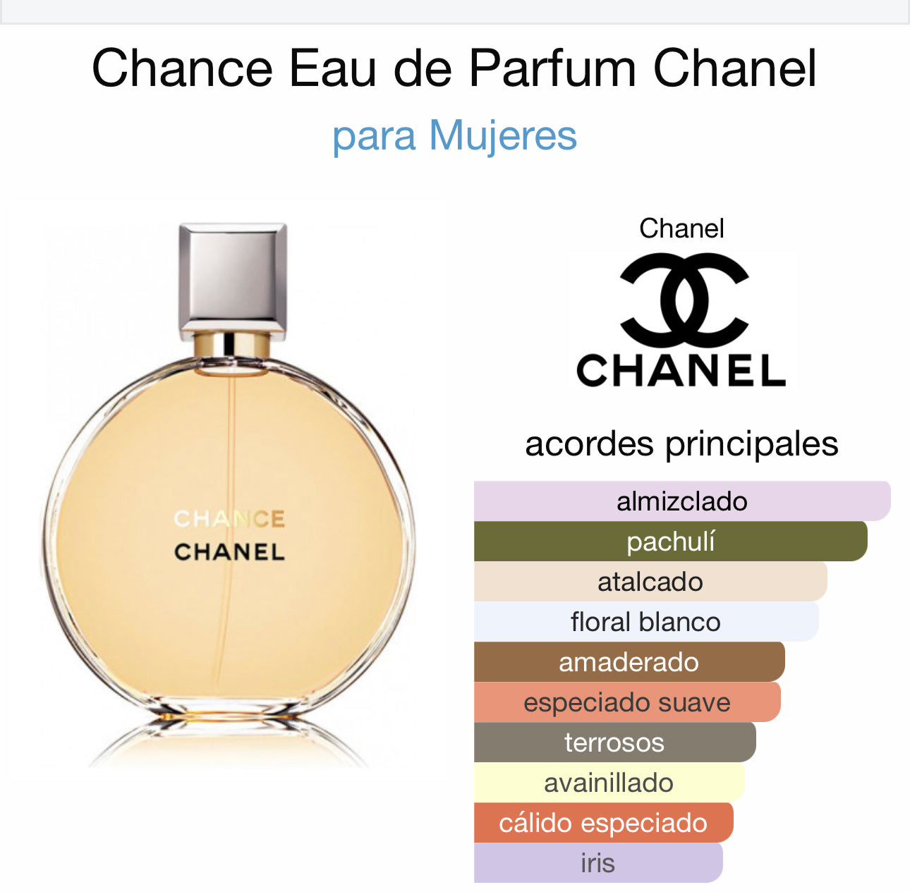 Chance Eau de Parfum de Chanel es una fragancia de la familia olfativa Chipre Floral para Mujeres. Chance Eau de Parfum se lanzó en 2005. La Nariz detrás de esta fragrancia es Jacques Polge. La Nota de Salida es pimienta rosa; las Notas de Corazón son jazmín y iris; las Notas de Fondo son pachulí, almizcle y vainilla.