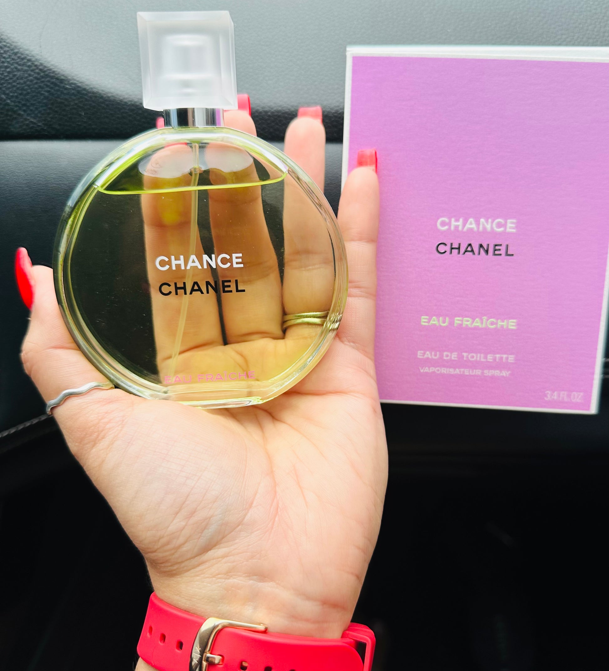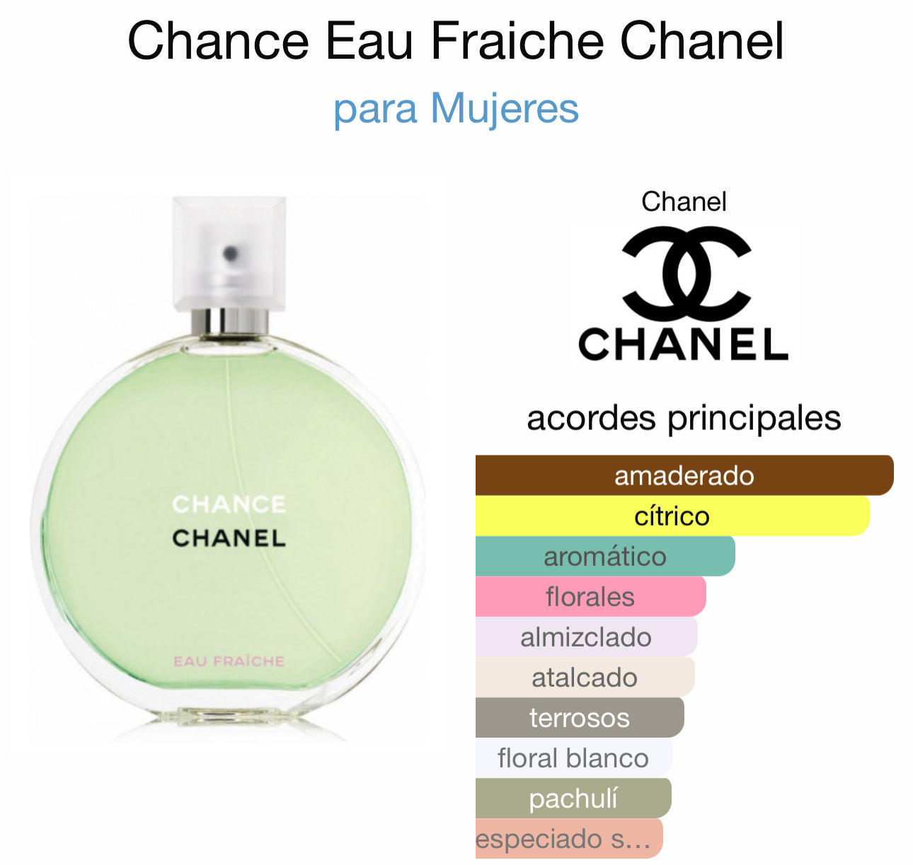 Chance Eau Fraiche de Chanel es una fragancia de la familia olfativa Chipre Floral para Mujeres. Chance Eau Fraiche se lanzó en 2007. La Nariz detrás de esta fragrancia es Jacques Polge. Las Notas de Salida son limón (lima ácida), cedro y cidra; las Notas de Corazón son jacinto de agua, pimienta rosa y jazmín; las Notas de Fondo son almizcle blanco, pachulí, vetiver, madera de teca, iris y ámbar.