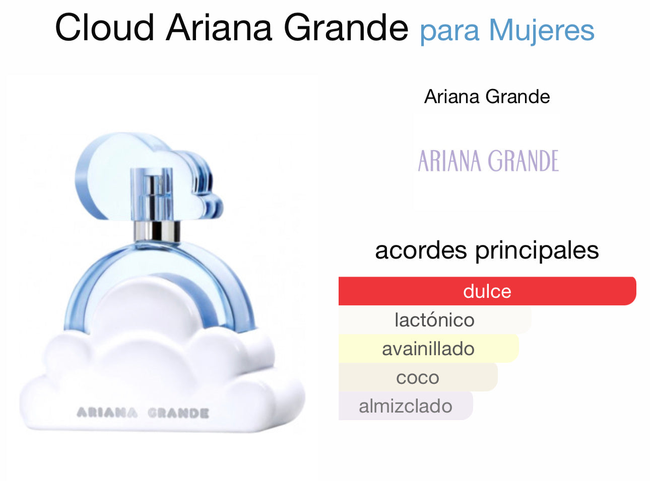 Cloud de Ariana Grande es una fragancia de la familia olfativa Floral Frutal Gourmand para Mujeres. Cloud se lanzó en 2018. La Nariz detrás de esta fragrancia es Clement Gavarry. Las Notas de Salida son lavanda, pera y bergamota; las Notas de Corazón son crema batida, praliné, coco y orquídea de vainilla; las Notas de Fondo son almizcle y notas amaderadas.