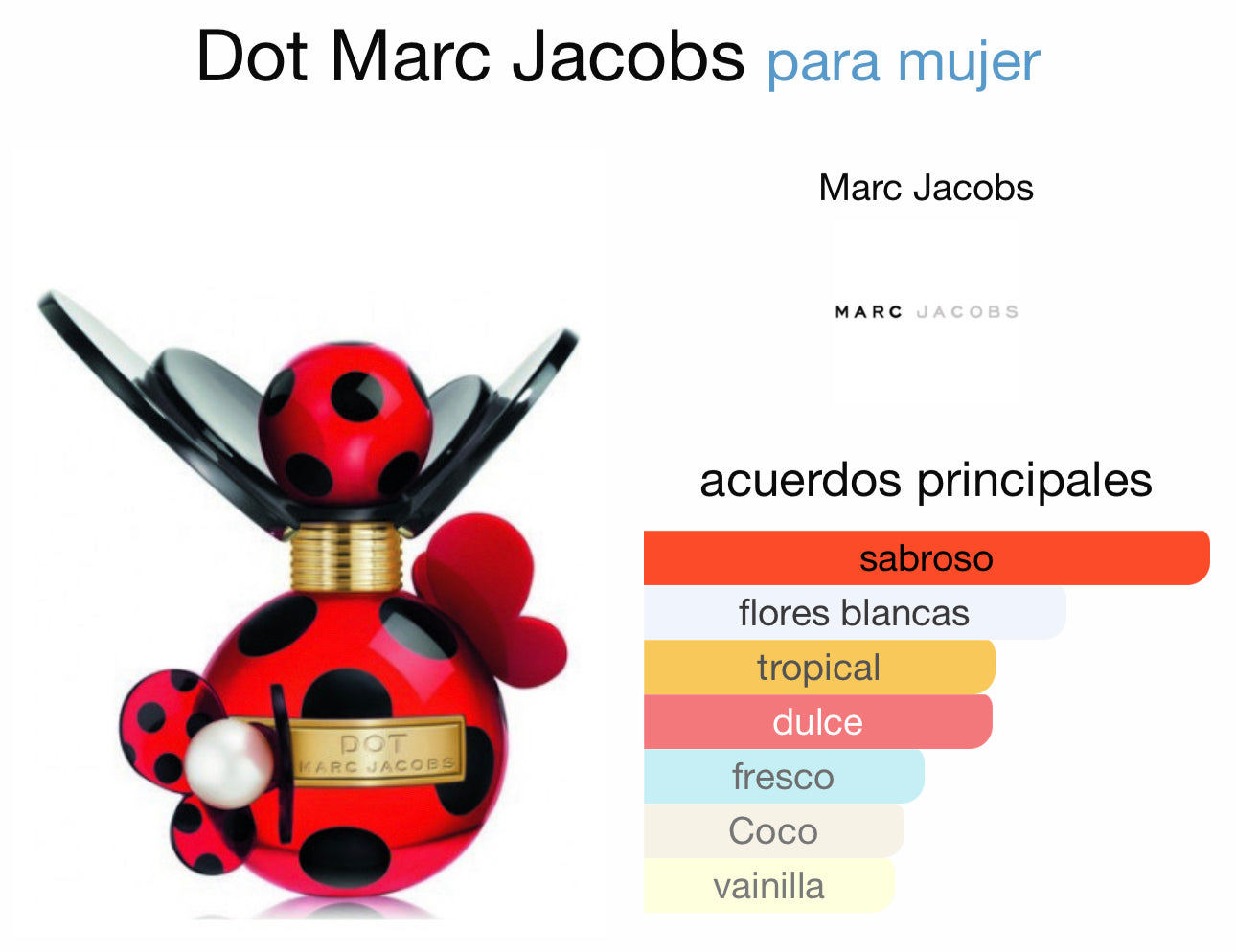 Dot de Marc Jacobs es una fragancia Floral Frutal para mujer. Dot se lanzó en 2012. Dot fue creado por Annie Buzantian y Ann Gottlieb. Las Notas de Salida son frutos rojos, pitahaya y madreselva; las Notas de Corazón son coco, jazmín y flor de naranjo; las Notas de Fondo son Driftwood, almizcle y vainilla.