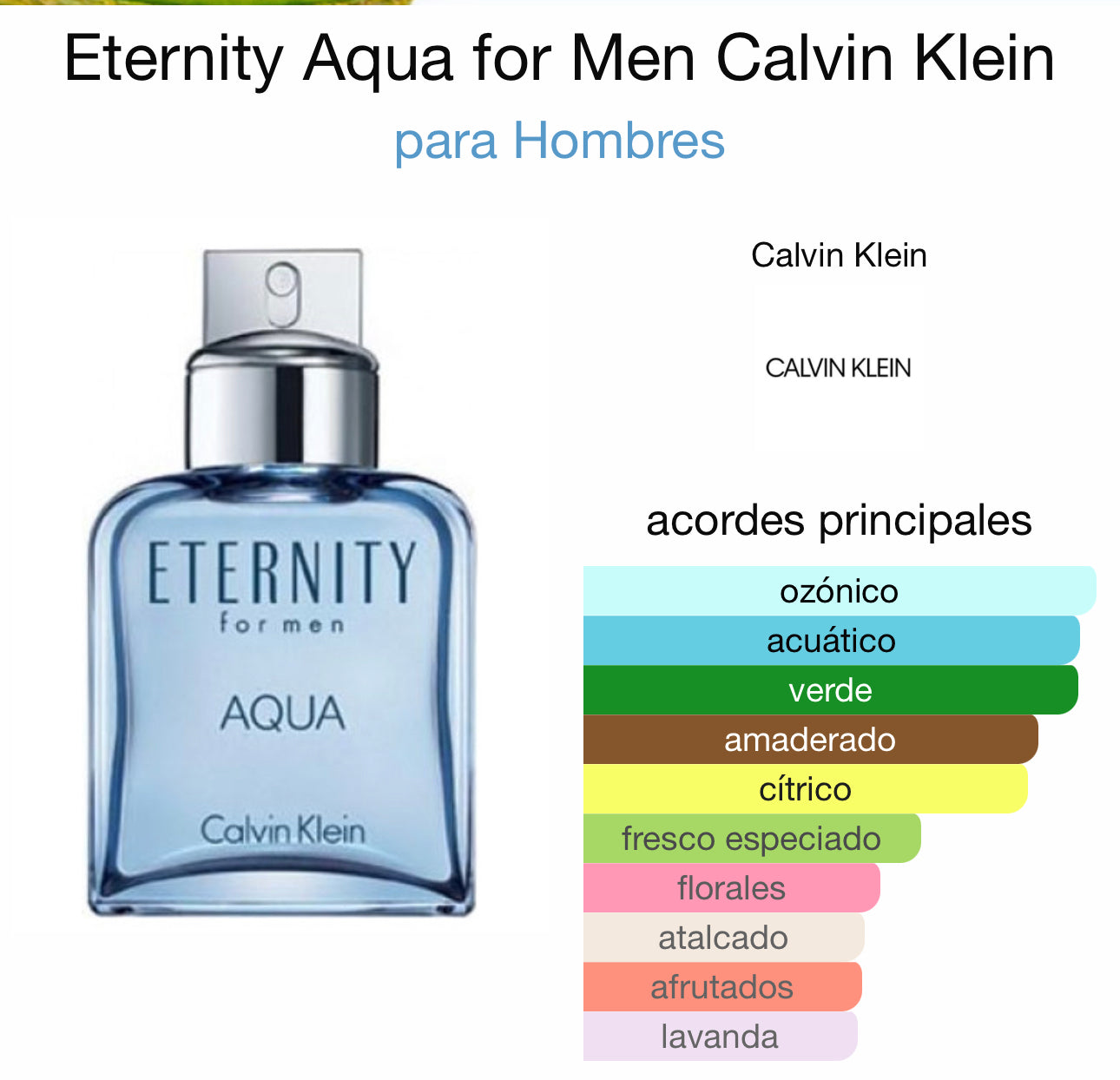 Eternity Aqua for Men de Calvin Klein es una fragancia de la familia olfativa Amaderada Aromática para Hombres. Eternity Aqua for Men se lanzó en 2010. Las Notas de Salida son pepino, cítricos, notas verdes y flor de loto; las Notas de Corazón son ciruela, lavanda, pimienta de Sichuan y cedro de Virginia; las Notas de Fondo son almizcle, sándalo, pachulí y madera de gaiac.