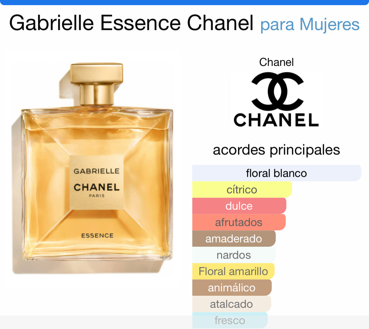 Gabrielle Essence de Chanel es una fragancia de la familia olfativa Almizcle Floral Amaderado para Mujeres. Gabrielle Essence se lanzó en 2019. La Nariz detrás de esta fragrancia es Olivier Polge. Las Notas de Salida son cítricos, durazno (melocotón), Frutas rojas, petit grain y grosellas negras; las Notas de Corazón son flores blancas, nardos, ylang-ylang, jazmín, flor de azahar del naranjo y coco; las Notas de Fondo son almizcle, vainilla y sándalo.