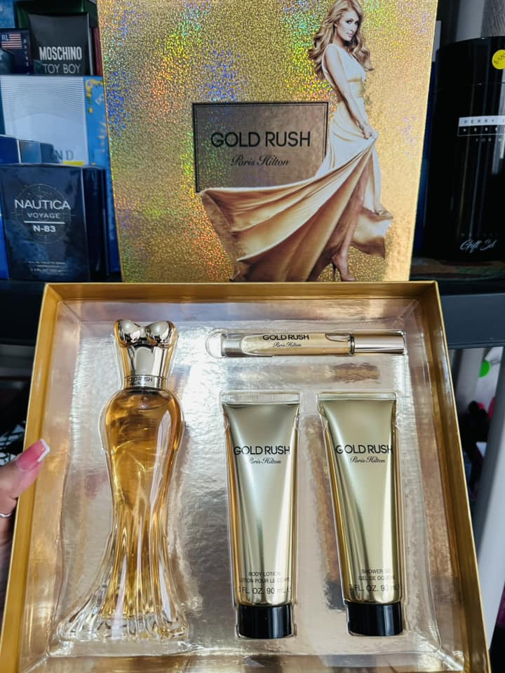 Gold Rush de Paris Hilton es una fragancia floral frutal gourmand para mujeres. Gold Rush se lanzó en 2016. Las Notas de Salida son nectarina, limón y bergamota; las Notas de Corazón son orquídea, pétalos de rosa y violeta; las Notas de Fondo son praliné, vainilla y madera de cachemira.