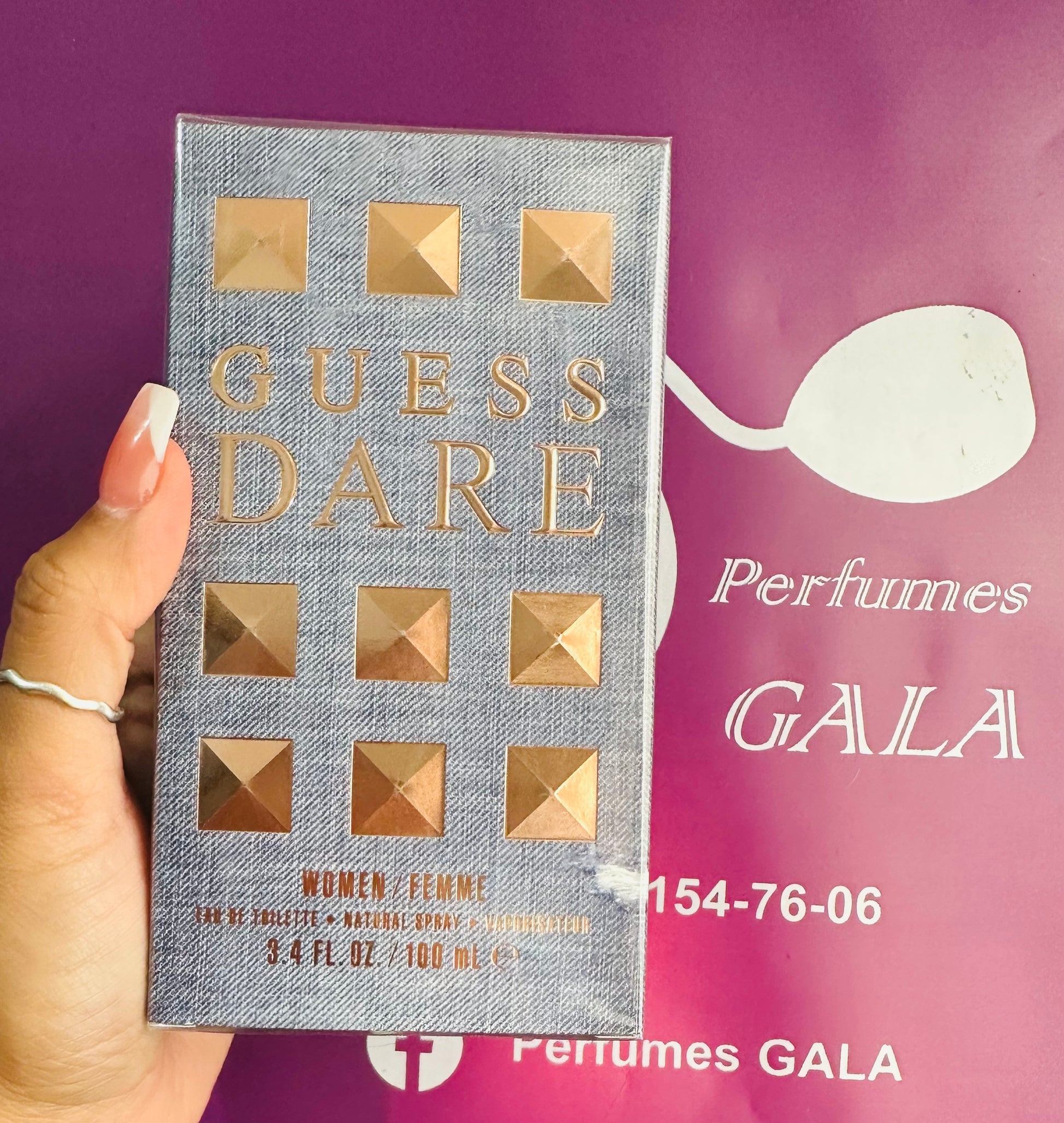 Guess Dare de Guess es una fragancia de la familia olfativa Almizcle Floral Amaderado para Mujeres. Guess Dare se lanzó en 2014. La Nariz detrás de esta fragrancia es Bruno Jovanovic. Las Notas de Salida son kumquat (naranja enana), flor del peral y flores de azahar del limonero; las Notas de Corazón son flor de cactus, jazmín y rosa silvestre; las Notas de Fondo son almizcle, notas amaderadas y coco.