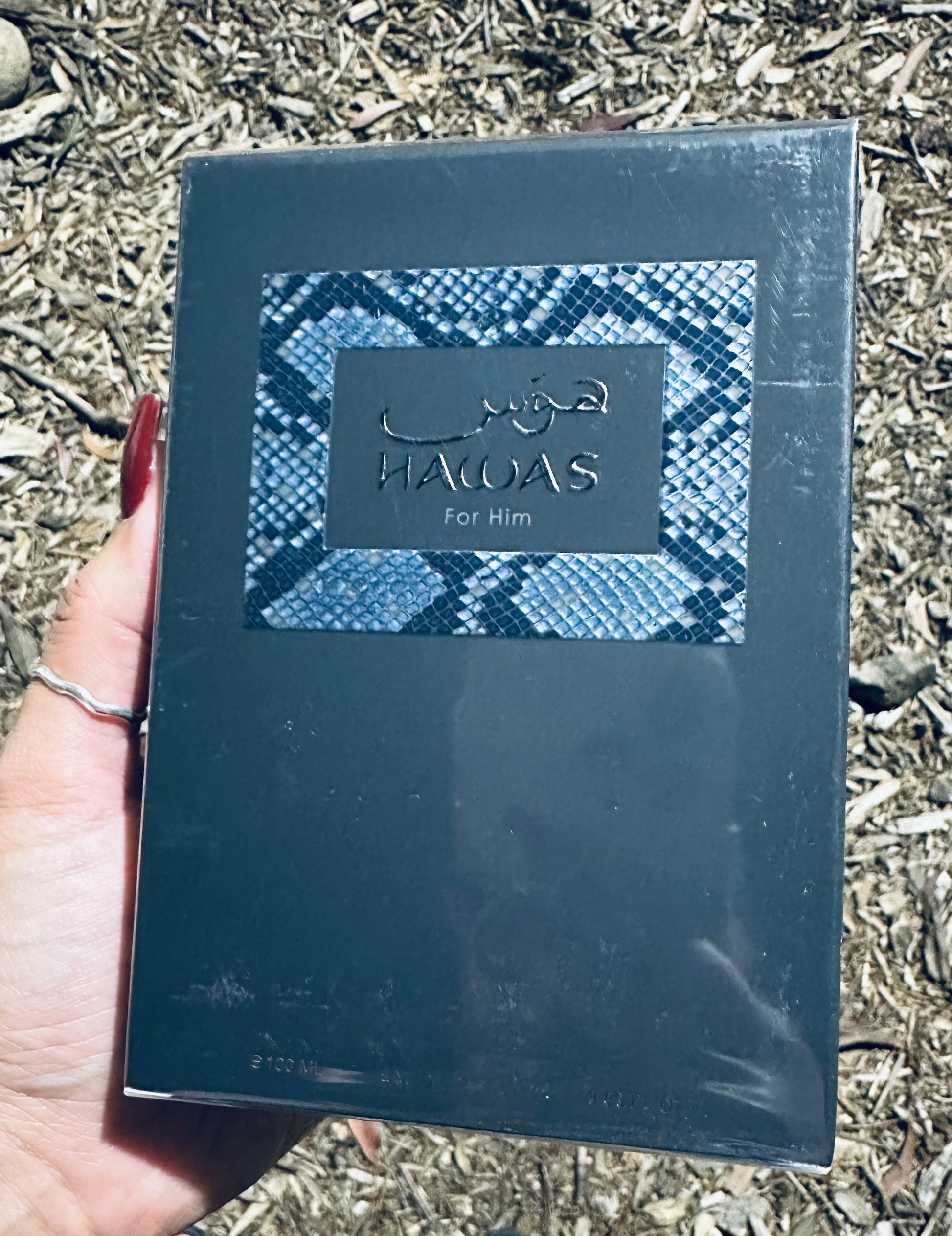 Hawas for Him de Rasasi es una fragancia de la familia olfativa Aromática Acuática para Hombres. Hawas for Him se lanzó en 2015. Las Notas de Salida son manzana, bergamota, limón (lima ácida) y canela; las Notas de Corazón son notas acuosas, ciruela, cardamomo y flor de azahar del naranjo; las Notas de Fondo son ámbar gris, almizcle, trozos de madera a la deriva y pachulí.