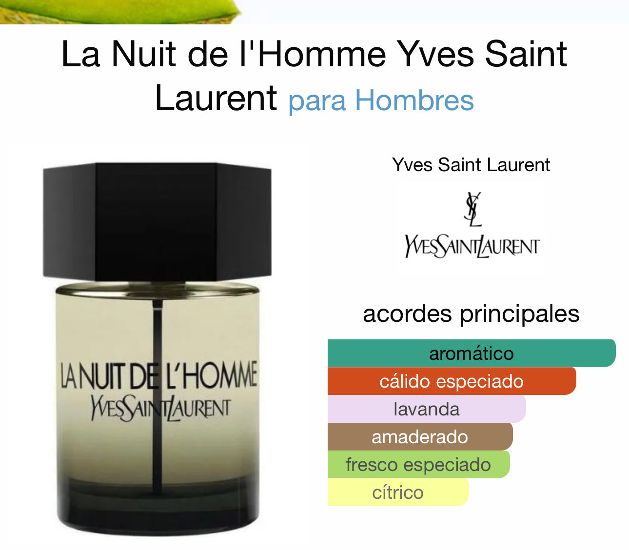 La Nuit de l'Homme de Yves Saint Laurent es una fragancia de la familia olfativa Amaderada Especiada para Hombres. La Nuit de l'Homme se lanzó en 2009. La Nuit de l'Homme fue creada por Anne Flipo, Pierre Wargnye y Dominique Ropion. La Nota de Salida es cardamomo; las Notas de Corazón son lavanda, cedro de Virginia y bergamota; las Notas de Fondo son vetiver y alcaravea.