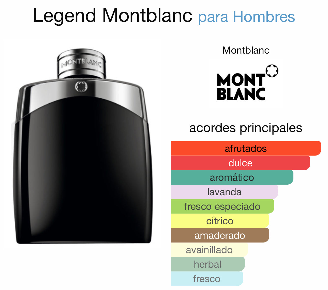 Legend de Montblanc es una fragancia de la familia olfativa Aromática Fougère para Hombres. Legend se lanzó en 2011. Legend fue creada por Olivier Pescheux y Celine Perdriel. Las Notas de Salida son lavanda, piña, bergamota y cedrón (hierba luisa, verbena de olor); las Notas de Corazón son manzana roja, frutos secos, musgo de roble, geranio, cumarina y rosa; las Notas de Fondo son haba tonka y sándalo.