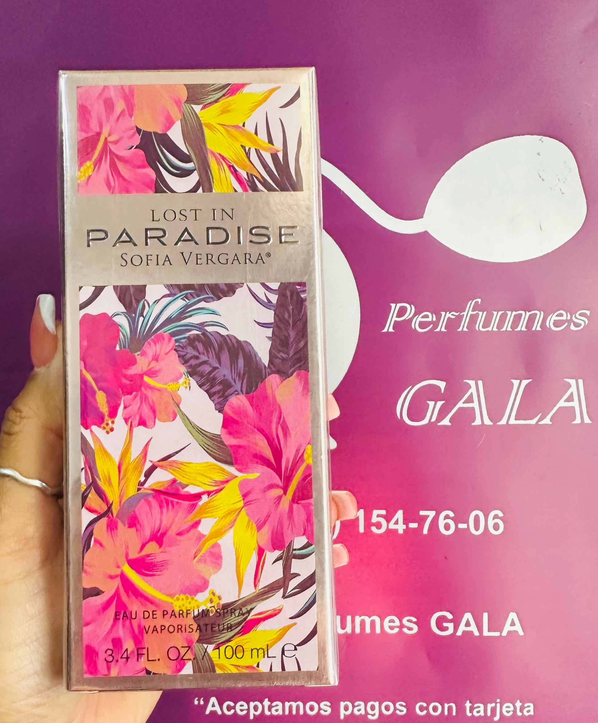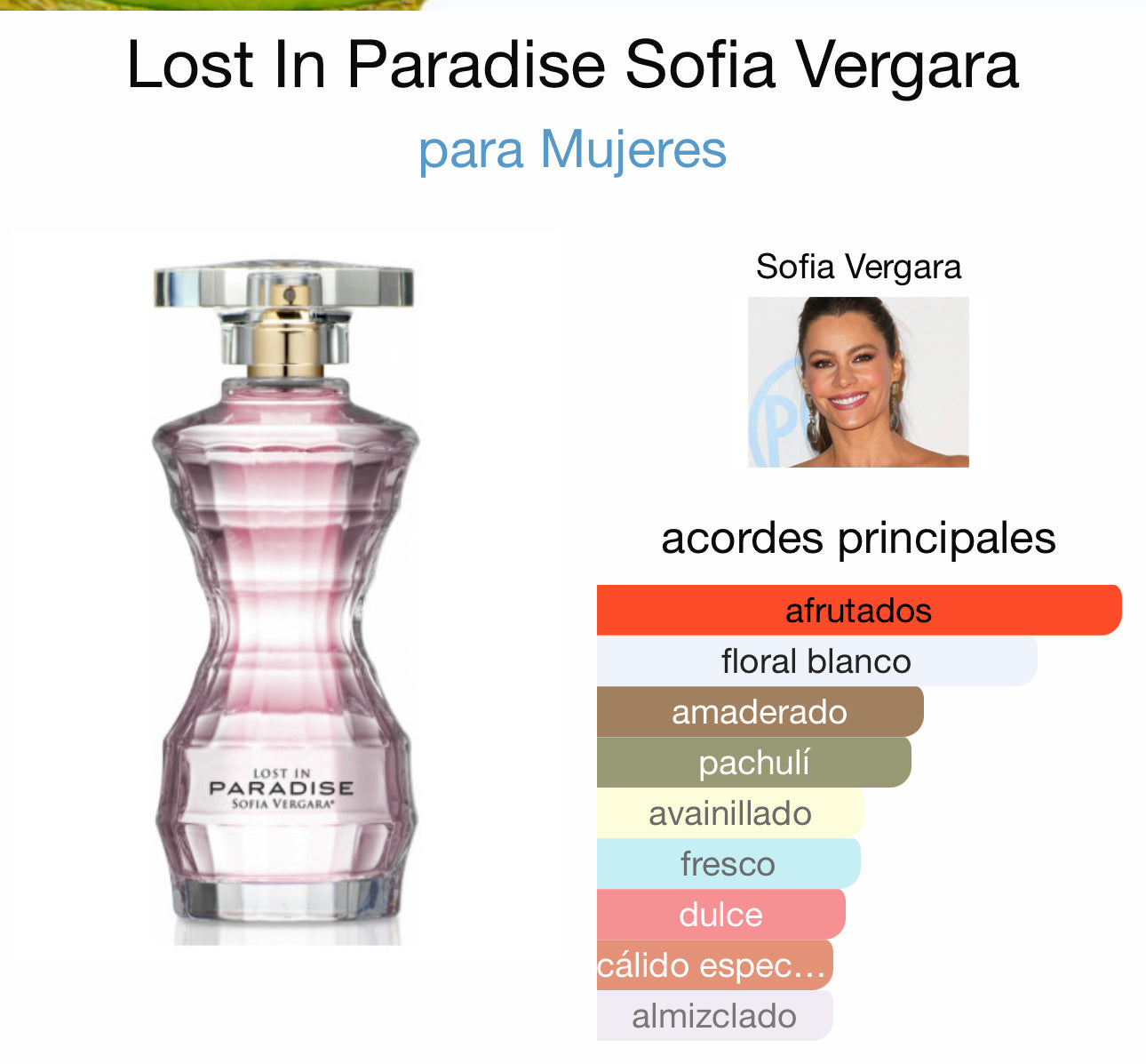 Lost In Paradise de Sofia Vergara es una fragancia de la familia olfativa Floral Frutal para Mujeres. Lost In Paradise se lanzó en 2019. Las Notas de Salida son Guanábana, Pera Nashi y manzana roja; las Notas de Corazón son lirio de los valles (muguete), gardenia y flor de azahar del naranjo; las Notas de Fondo son pachulí, vainilla, madera de teca y almizcle.