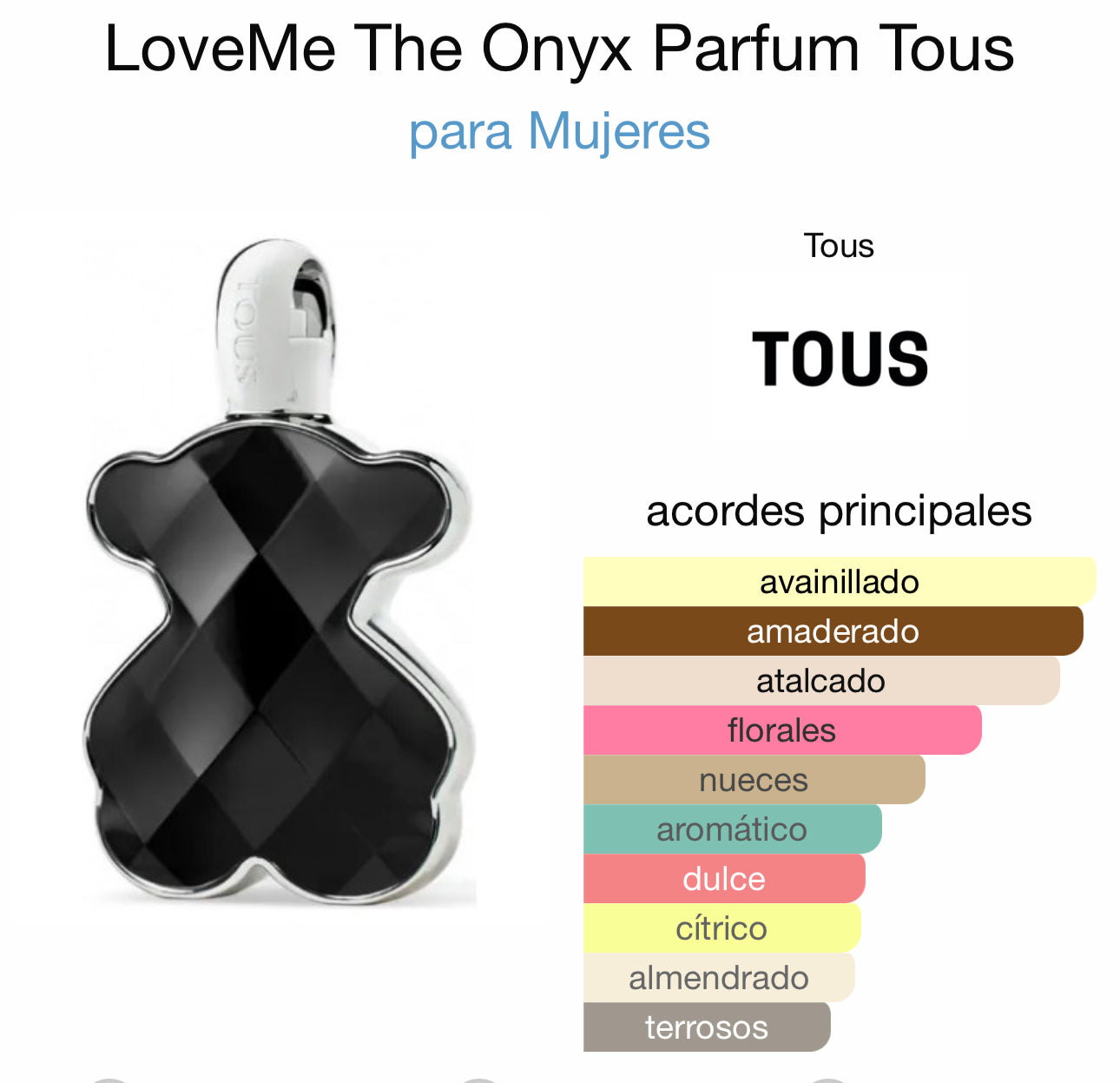 LoveMe The Onyx Parfum de Tous es una fragancia de la familia olfativa Ámbar Floral para Mujeres. LoveMe The Onyx Parfum se lanzó en 2021. LoveMe The Onyx Parfum fue creada por Domitille Michalon Bertier y Christian Alori. Las Notas de Salida son avellana, toronja (pomelo) y peonía; las Notas de Corazón son heliotropo y orquídea negra; las Notas de Fondo son vainilla, vetiver y sándalo.
