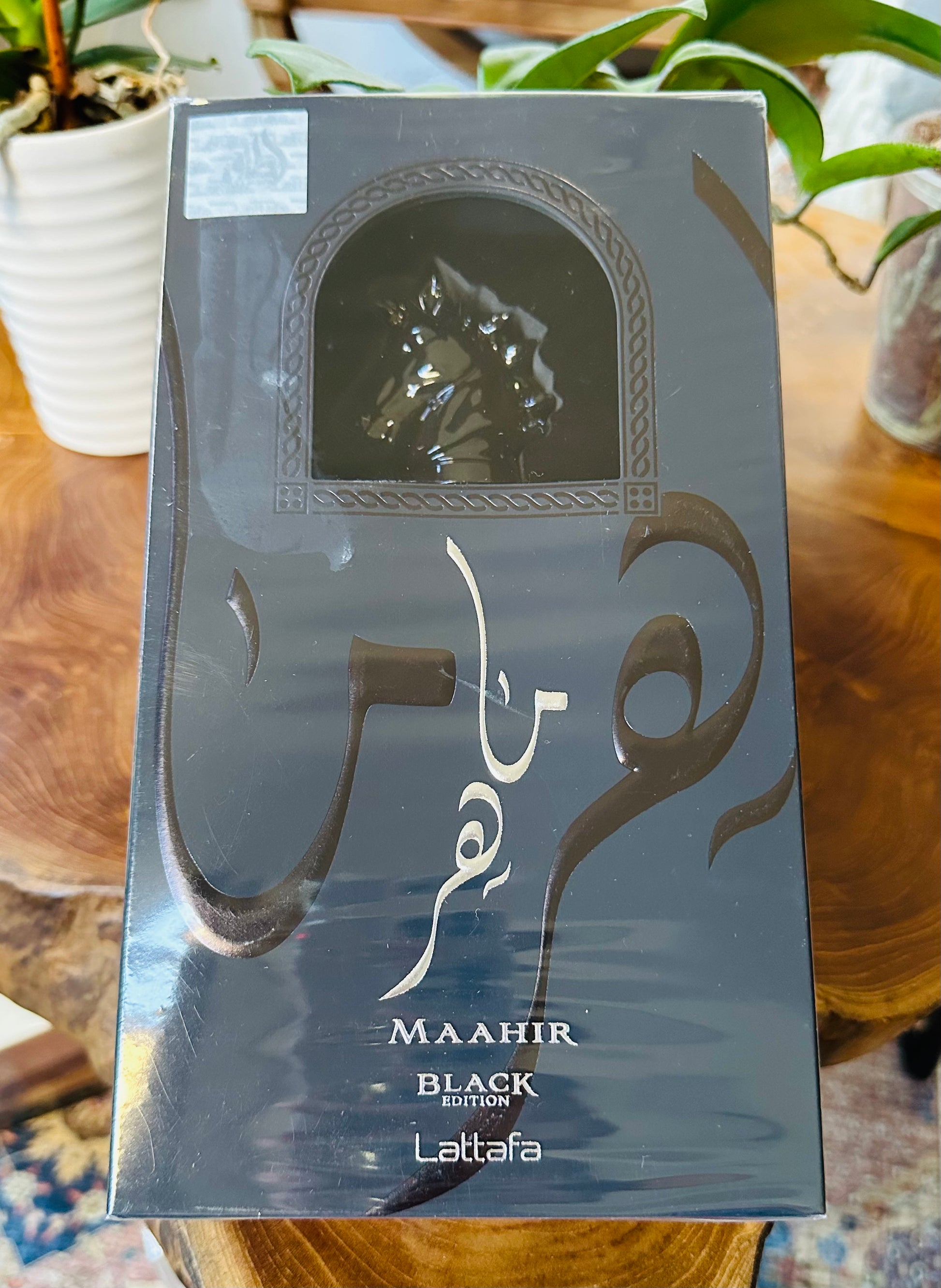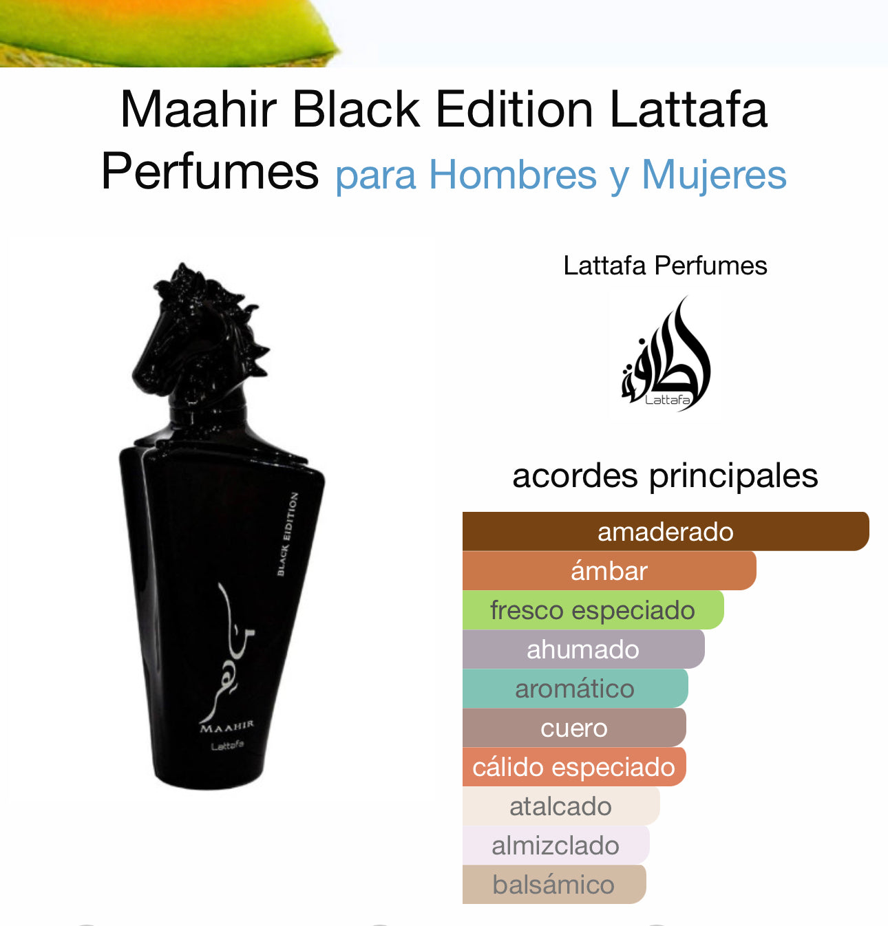 Maahir Black Edition de Lattafa Perfumes es una fragancia de la familia olfativa Ámbar Especiada para Hombres y Mujeres. Maahir Black Edition se lanzó en 2019. Las Notas de Salida son pimienta negra, pimienta rosa y azafrán; las Notas de Corazón son ládano, Petróleo de Cade, bálsamo de Gurjum y ruibarbo; las Notas de Fondo son cuero, cedro, pachulí, madera de gaiac, almizcle y musgo.