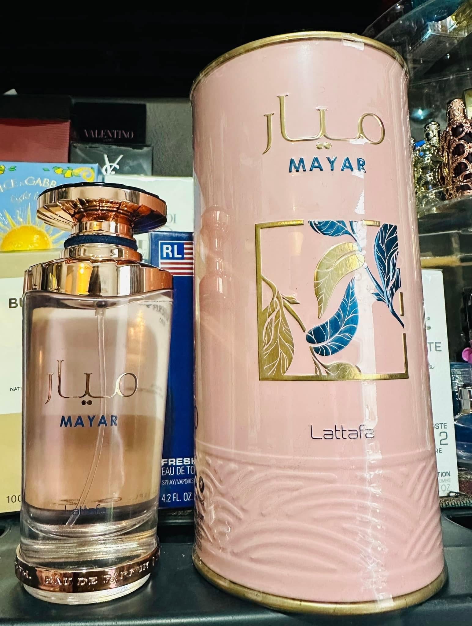 Mayar de Lattafa Perfumes es una fragancia de la familia olfativa Floral Frutal para Mujeres. Esta fragrancia es nueva. Mayar se lanzó en 2022. Las Notas de Salida son lichi, frambuesa y hojas de violeta; las Notas de Corazón son peonía, rosa blanca y jazmín; las Notas de Fondo son vainilla y almizcle.