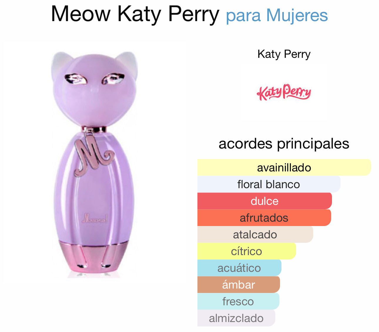 Meow de Katy Perry es una fragancia de la familia olfativa Floral Frutal para Mujeres. Meow se lanzó en 2011. La Nariz detrás de esta fragrancia es Givaudan. Las Notas de Salida son pera, naranja tangerina, gardenia y jazmín; las Notas de Corazón son madreselva, flor del naranjo africano y lirio de los valles (muguete); las Notas de Fondo son vainilla, ámbar, almizcle y sándalo.