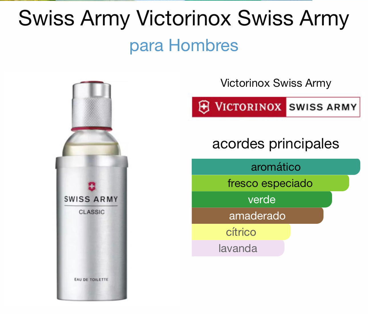 Swiss Army de Victorinox Swiss Army es una fragancia de la familia olfativa Amaderada Aromática para Hombres. Swiss Army se lanzó en 1997. Las Notas de Salida son menta, notas verdes, bergamota, yuzu y jengibre; las Notas de Corazón son lavanda, romero, hojas de violeta, flor de las nieves (flor de edelweiss) y geranio; las Notas de Fondo son ciprés, abeto balsámico, cedro, almizcle y ámbar.
