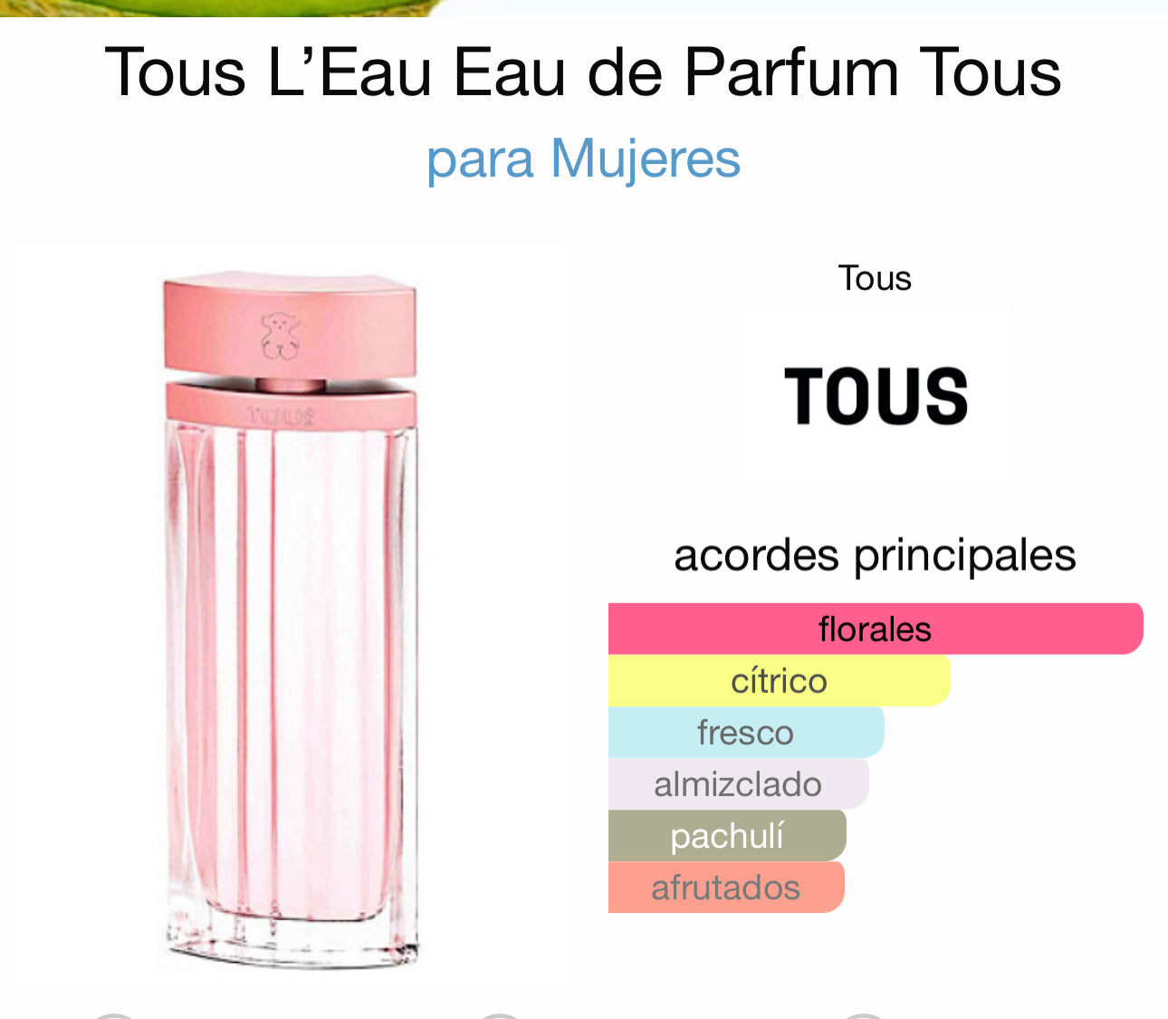 Tous L’Eau Eau de Parfum de Tous es una fragancia de la familia olfativa Almizcle Floral Amaderado para Mujeres. Tous L’Eau Eau de Parfum se lanzó en 2011. La Nariz detrás de esta fragrancia es Nathalie Lorson. Las Notas de Salida son notas florales, limón de Amalfi (lima de Amalfi) y mandarina; las Notas de Corazón son fresia, peonía, grosellas negras y jazmín; las Notas de Fondo son almizcle, pachulí y ámbar.