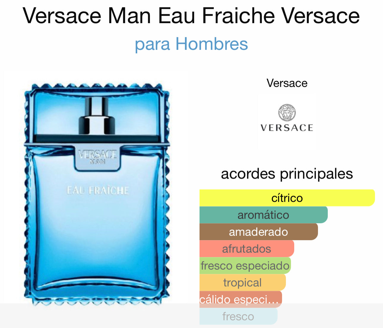 Versace Man Eau Fraiche de Versace es una fragancia de la familia olfativa Amaderada Acuática para Hombres. Versace Man Eau Fraiche se lanzó en 2006. La Nariz detrás de esta fragrancia es Olivier Cresp. Las Notas de Salida son limón (lima ácida), bergamota, carambola, cardamomo y palo de rosa de Brasil; las Notas de Corazón son cedro, estragón, salvia y pimienta; las Notas de Fondo son almizcle, notas amaderadas, azafrán, ámbar y madera de sicómoro.