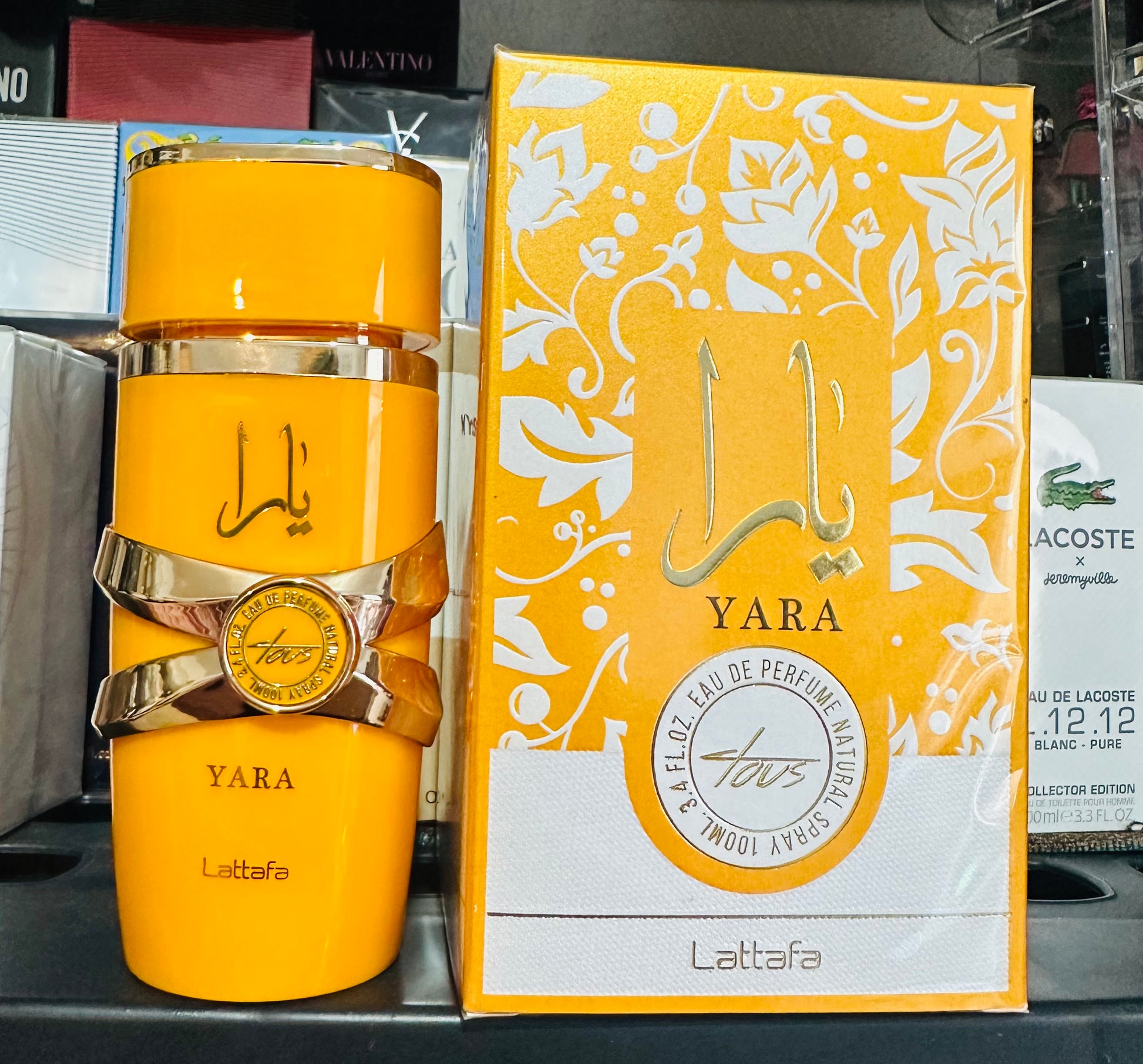 Yara Tous de Lattafa Perfumes es una fragancia de la familia olfativa para Mujeres. Esta fragrancia es nueva. Yara Tous se lanzó en 2023. Las Notas de Salida son mango, coco y maracuyá (fruta de la pasión); las Notas de Corazón son jazmín, heliotropo y flor de azahar del naranjo; las Notas de Fondo son vainilla, almizcle y cachemira.